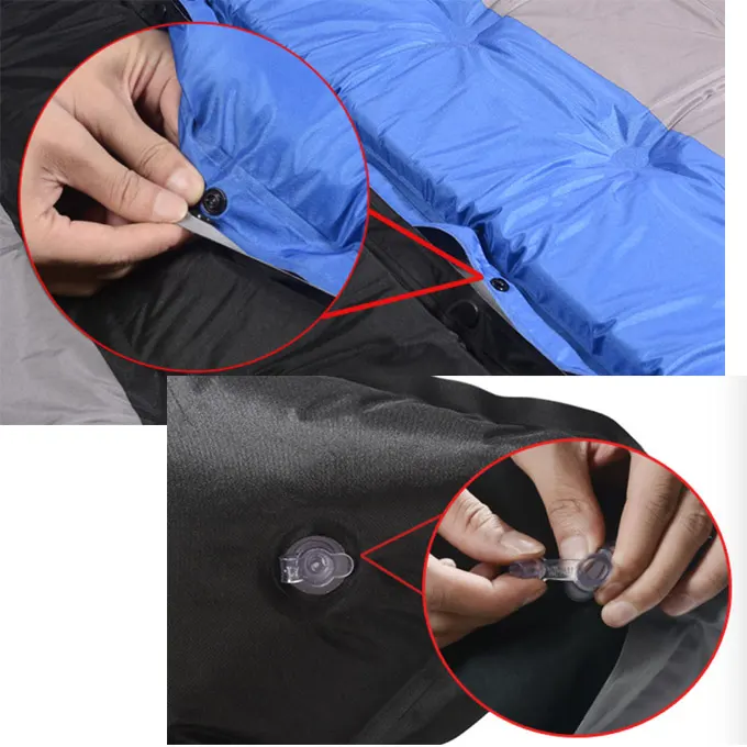Подлога за спавање на надувавање направљена од 75Д меке тканине, издржљива и водоотпорна; Може спречити цурење; водоотпоран; цепање и пробијање, што вам може обезбедити удобан сан било где на отвореном